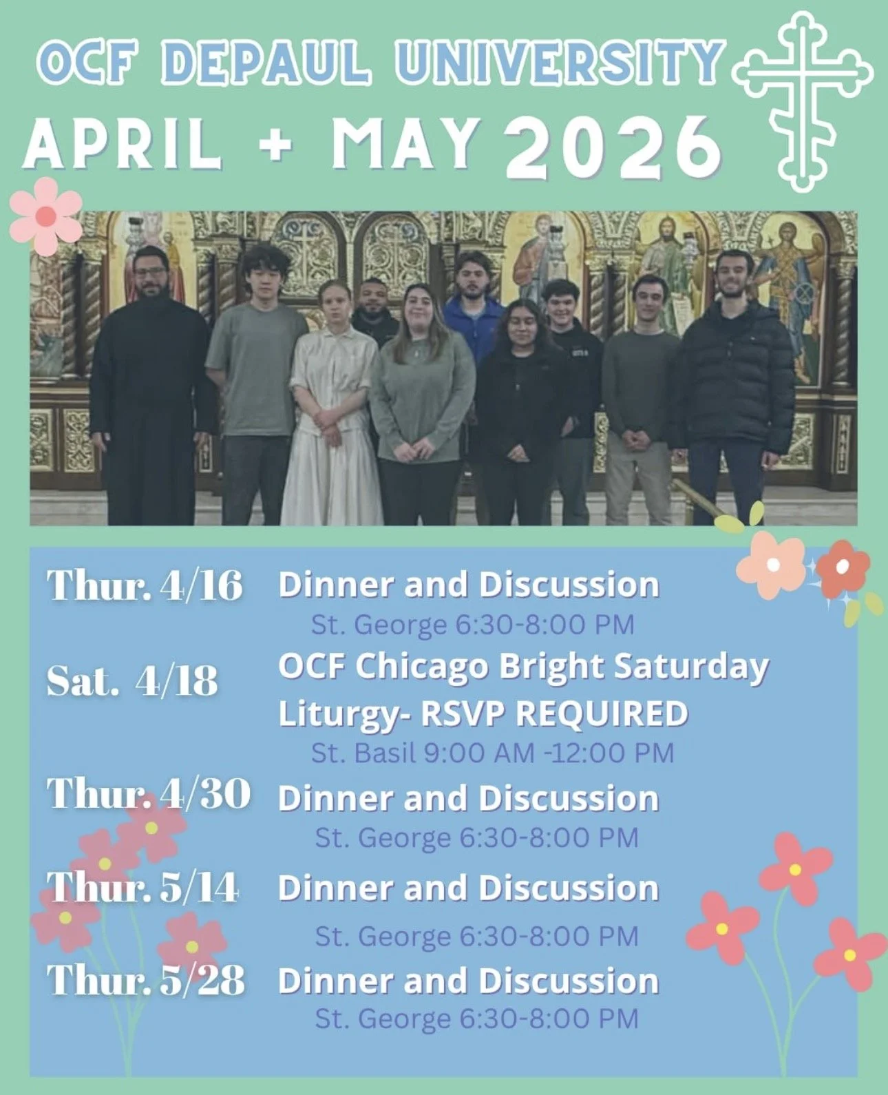 Next event is on April 30th starting at 6:30 PM. Student meet at St. George for dinner and discussion led by Fr. Joseph and Fr. Chrysanthos.