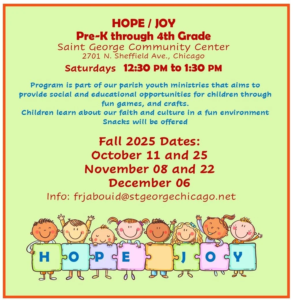 Our HOPE/JOY meets on alternate Saturdays and provides an opportunity for children to learn about our faith and culture in a fun safe environment. Fall sessions meet every other Saturday, alternating with Bitty Basketball.